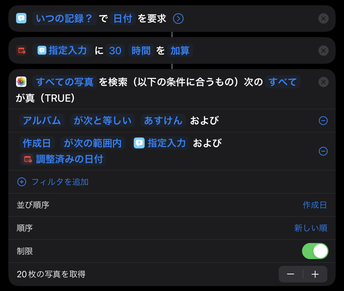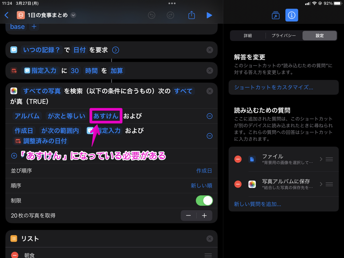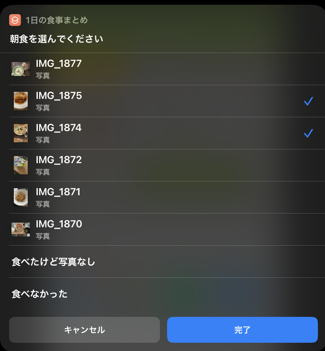 食事写真まとめは1つのショートカットで処理するとごちゃごちゃするので、分けて作った。
