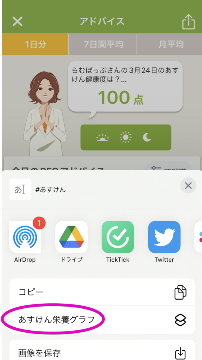 あすけんの栄養素グラフの画面の共有ボタンからは、栄養素グラフと「#あすけん」という文字列の2つが入力として入ってくる。