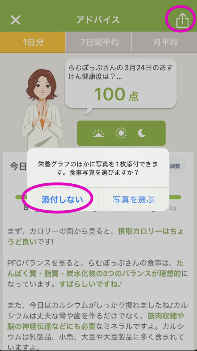 こんな感じに1日分の写真と栄養素グラフをまとめることができる。