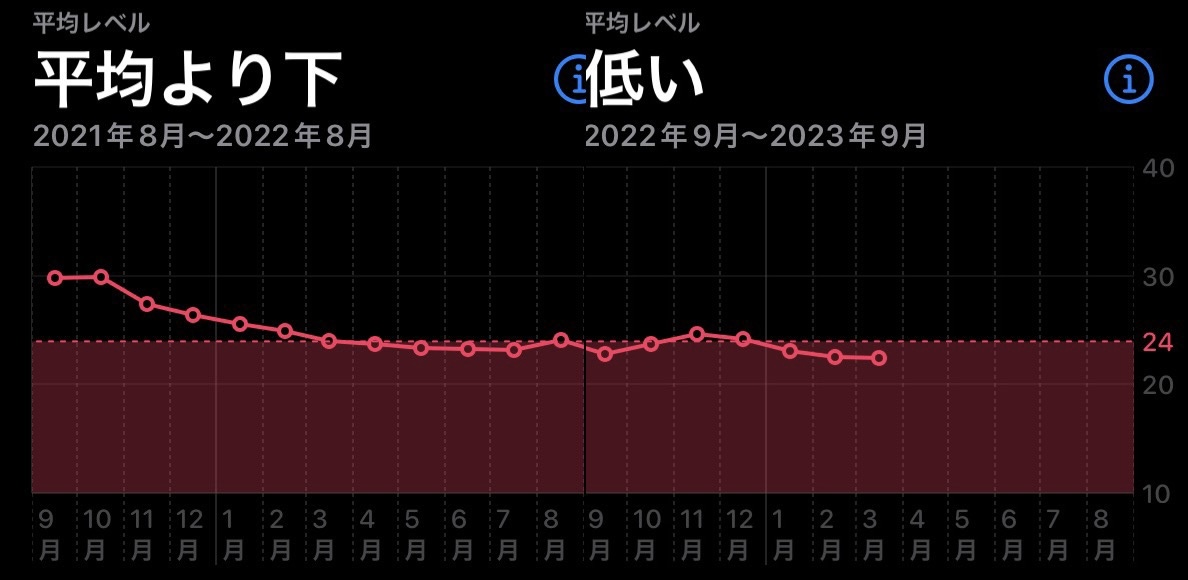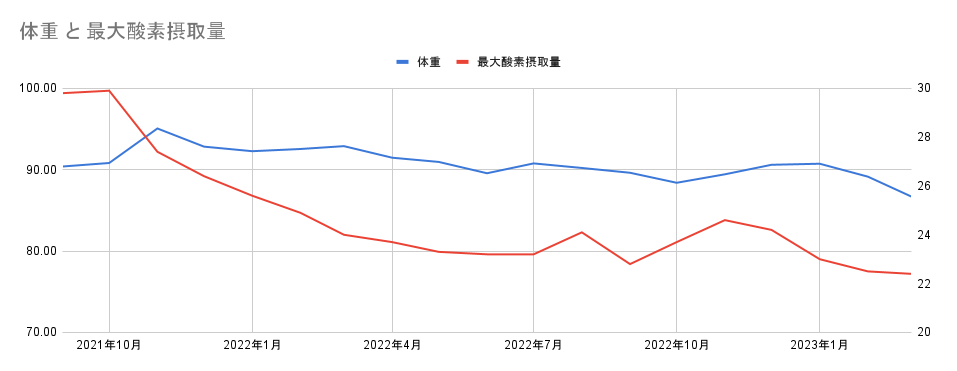 最初の2ヶ月程度こそ体重と連動してそうな感じだけど、うっすら体重が減ってるのに最大酸素摂取量はどんどん減っている。