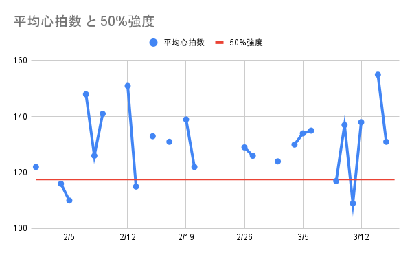 2/1からVO2max最低値を叩き出した3/14までの期間の、リングフィットアドベンチャーをやっている時の平均心拍数はこちら。