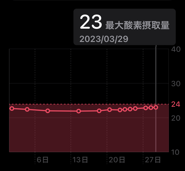 それでもこのゆっくり目に歩くのが効果があったのか、最大酸素摂取量が23まで上がった!!